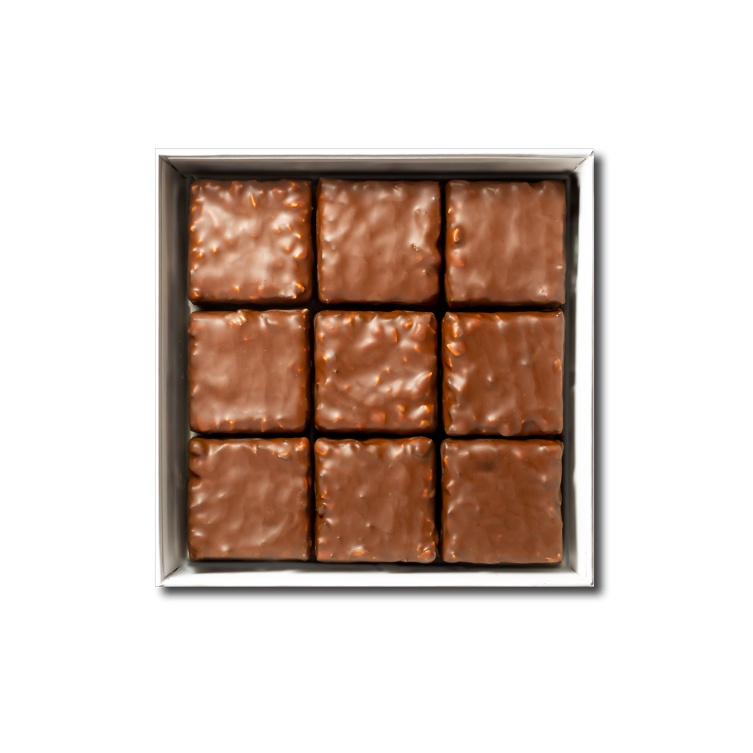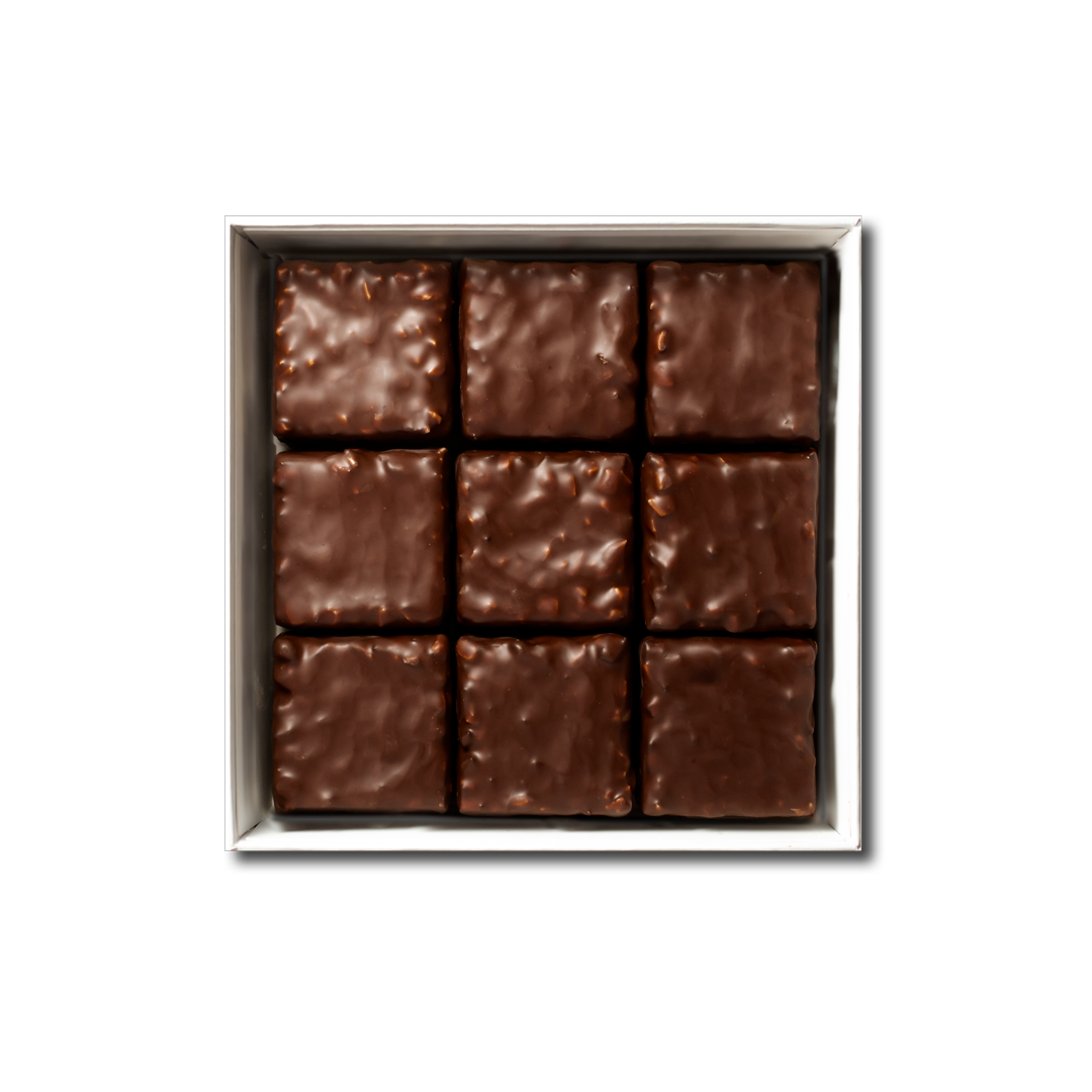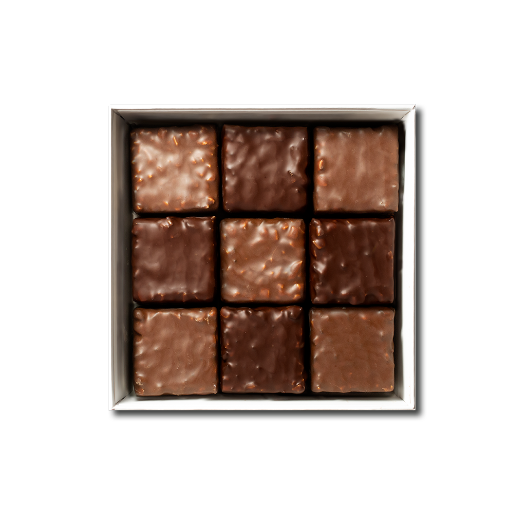Massifs, indisciplinés, craquants. Un cœur de praliné amandes de Drôme et noisettes du Lot-et-Garonne, façonné sans compas ni égards pour la symétrie. Chaque pièce est un éboulement heureux : brut, généreux, terriblement addictif.